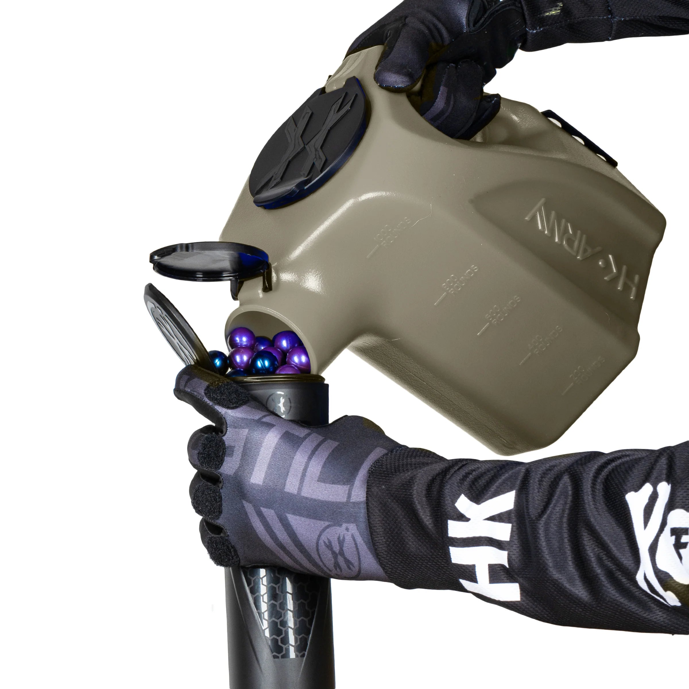 This multipurpose accessory is loaded with features that save money and improve performance. The durable plastic exterior provides a safe environment for storing paint, as well as five integrated volume markers displayed vertically along one side. The loading spout and pouring spout come equipped with attached lock lids, preventing spills and wasted paint. An additional bonus is a very handy Ball Sizer which slides securely into place at the back of the unit, allowing for players to easily match paint and barrel bore sizes.