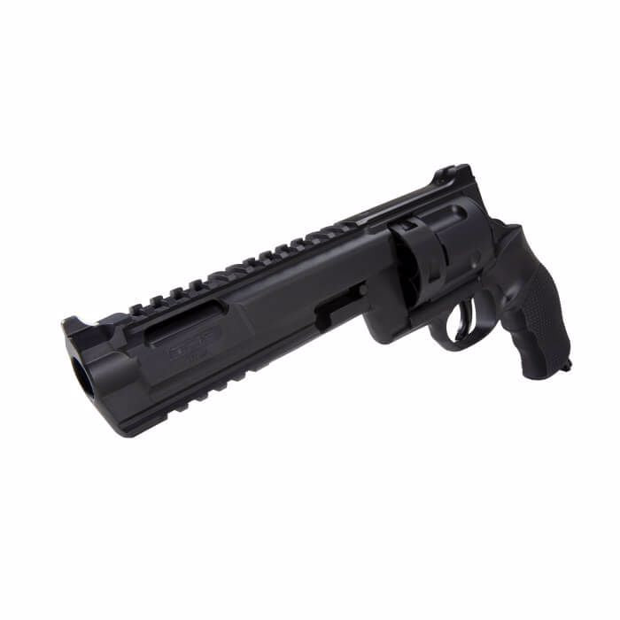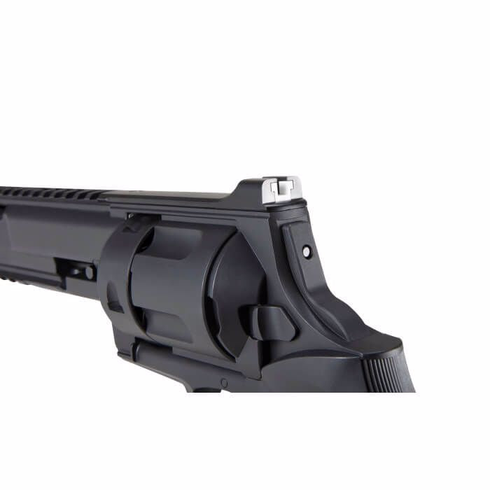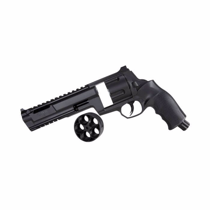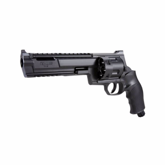 The T4E TR 68 paintball marker brings the revolver into the 21st century. This marker is powered by a single 12 gram non-threaded CO2 cartridge housed in the grip and is equipped with T4E's Quick Pierce CO2 cartridge puncturing system. The TR 68 Revolver holds five .68 caliber rubber, paint, or dust projectiles and launches them through the double action pull of the trigger. The three included rotary magazine disks allow for fast and easy reloading. The TR 68 Revolver has two sections of Picatinny rail, one on the top strap that is ideal for a compact reflex sight and one below the barrel which is ideal for a laser or tactical light. This marker is rated for 7.5 Joules.