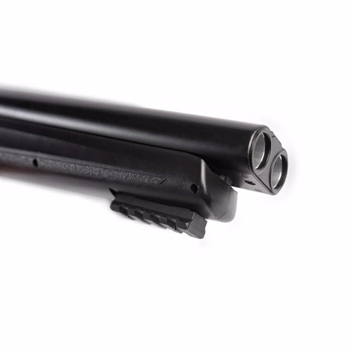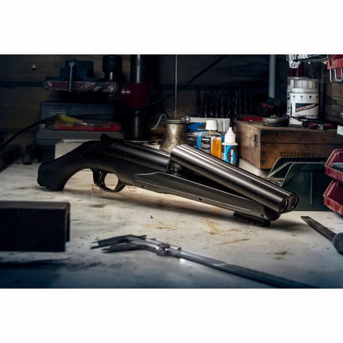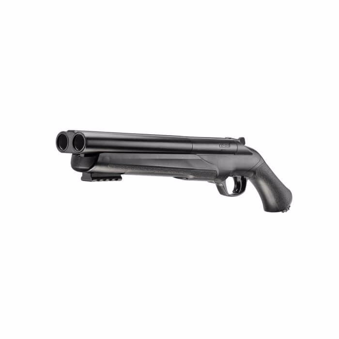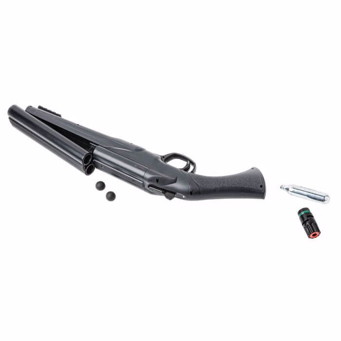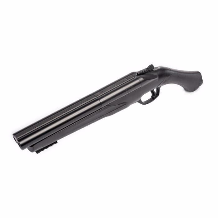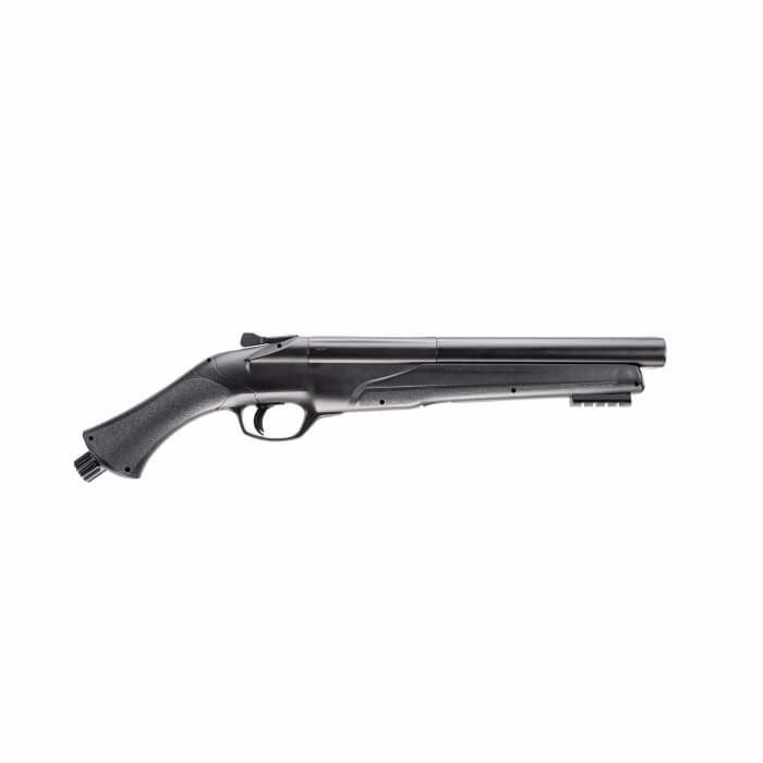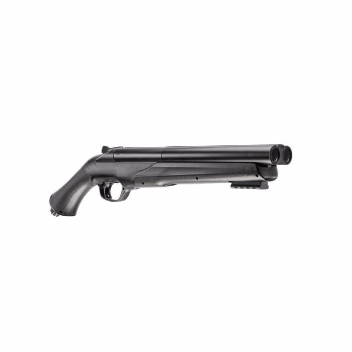 The T4E TS 68 .68 Caliber Paintball marker takes its design from a side-by-side shotgun pistol or a sawed-off shotgun. This marker can use .68 caliber paint or rubber balls and will launch them at 200 FPS. It can also sire chalk balls or pepper balls. The TS 68 is only 19.3 inches long and features a 7.7-inch barrel and a Quick Piercing CO2 mechanism that allows for instant charging. Also included standard on the HDS is an under-barrel Picatinny accessory rail. Shoot either of two barrels or both barrels at once! Load up your 12 gram CO2, pop two projectiles into the breech, and flip the switch to choose how to send them flying. The TS 68 is made out of sturdy polymer and aluminum. This marker is rated for 5.6 Joules.
