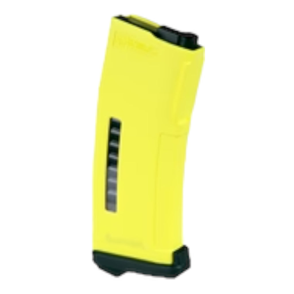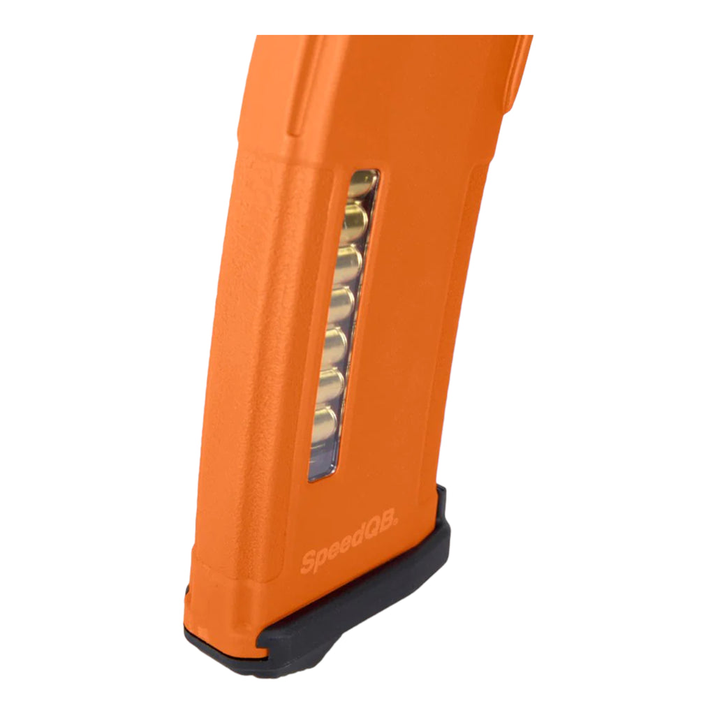 The magazine features a Dupont® Polymer shell, with recessed panels for better grip, and unique mag well guides that reduce snagging when drawn in/out of pouches. The mock ammunition window serves as an ammo indicator. When the magazine is fully loaded, a bright orange follower comes into view. An angled, rubber overmold baseplate makes for easy indexing and fast reloads.